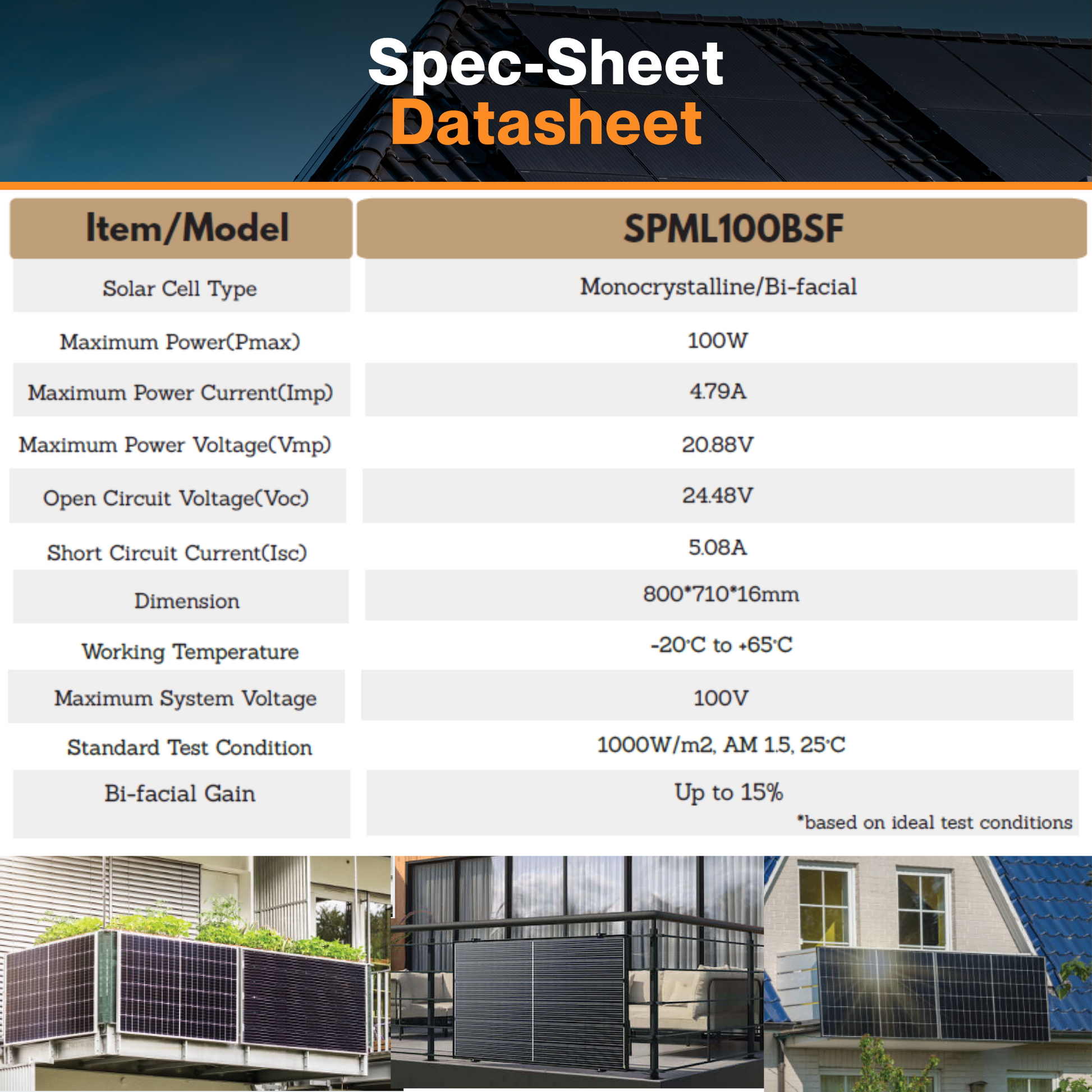 - Bifacial with Excellent Light Transmission: The Bifacial Portable 100W Balcony Semi-Flexible Solar Panel stands out with its distinctive bifacial design and advanced Monocrystalline technology, incorporating robust components for prolonged durability. It exceeds standard panels, particularly in direct sunlight, achieving an impressive conversion rate ranging from 30% thanks to outstanding light transmission and resilience. Importantly, the PV panels come equipped with safeguards against overcharging, overheating, and short-circuiting, ensuring a reliable and secure performance.