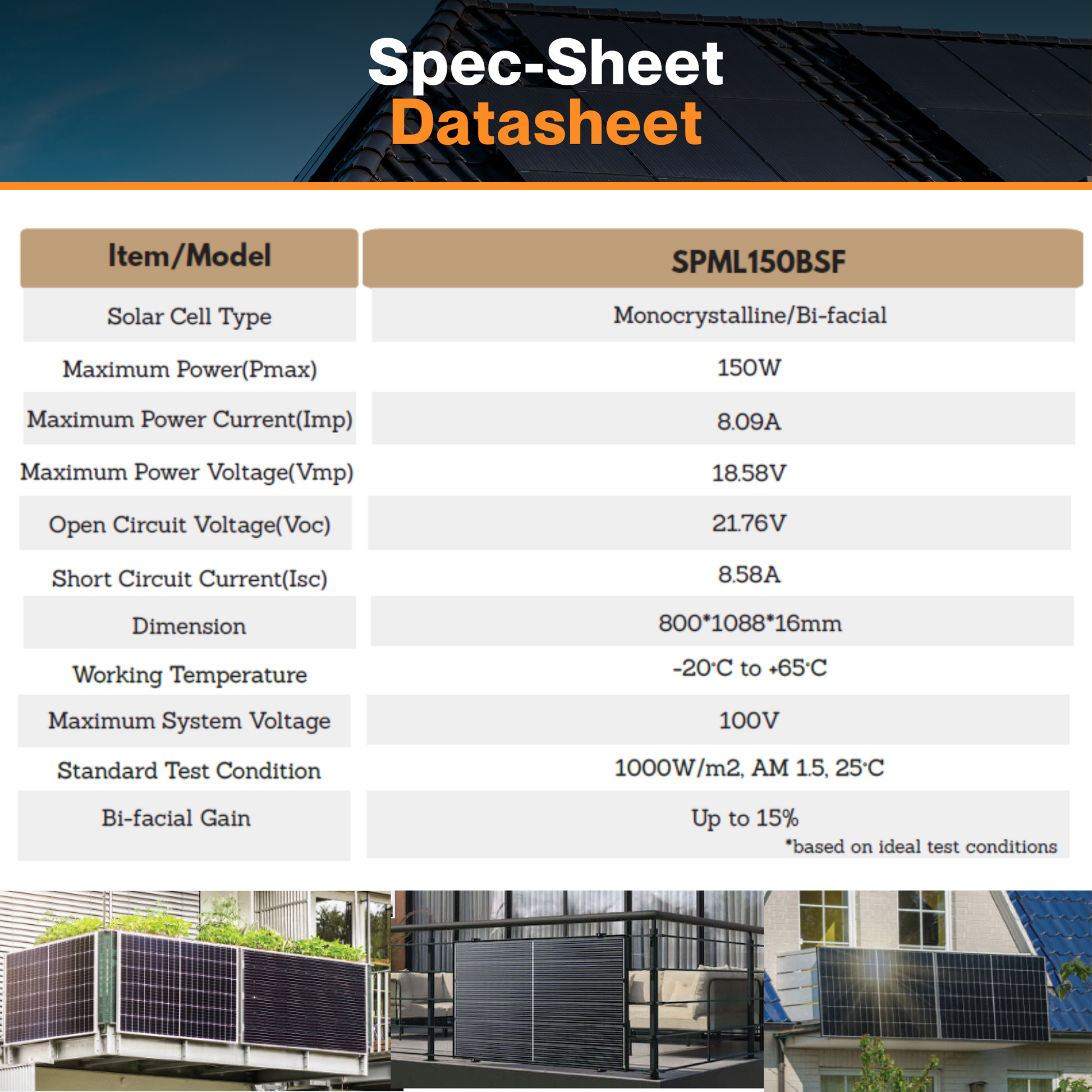 - Maximum Power(Pmax): 150W
