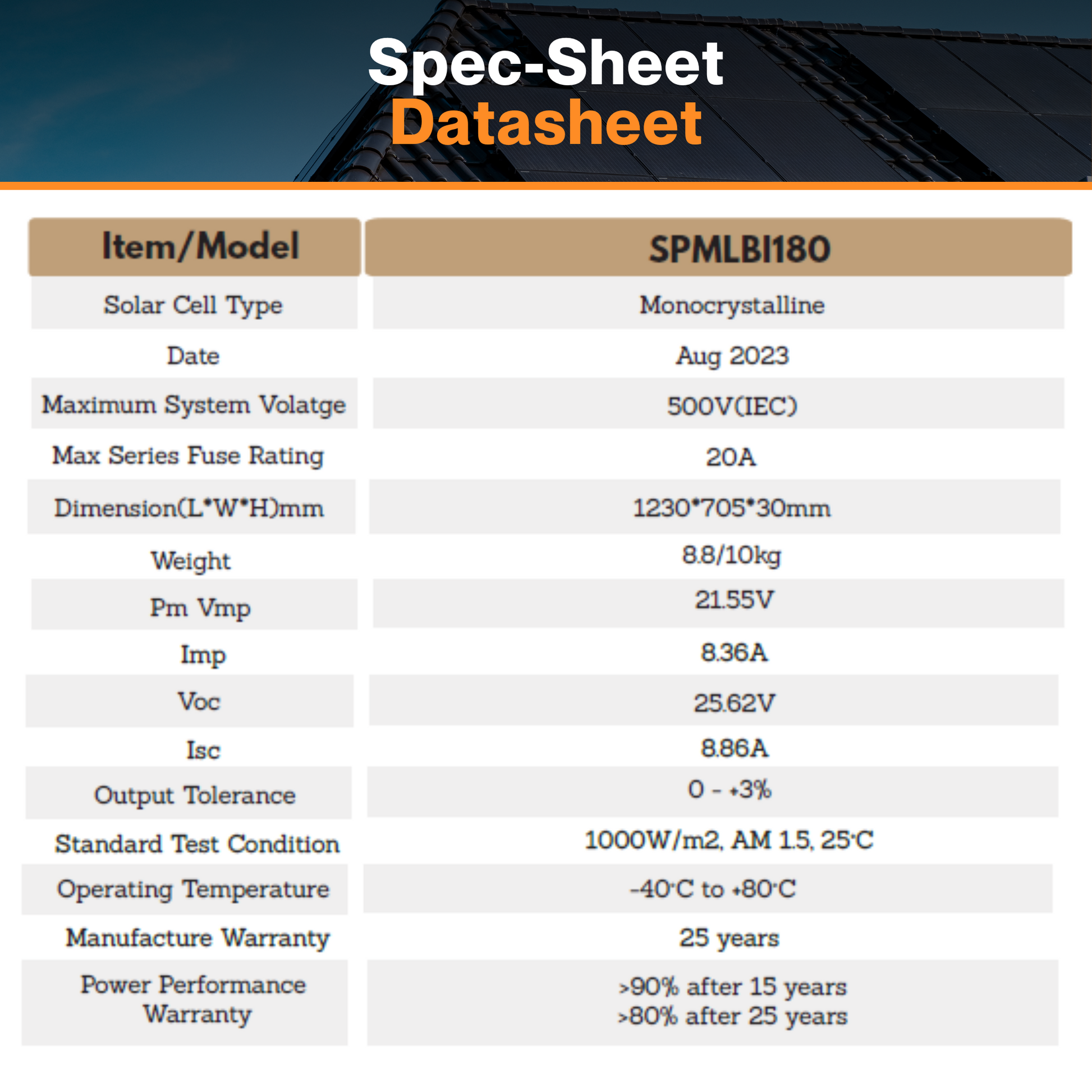 - Steadfast Power Output: Depend on the consistent power output of our 180W Mono Rigid Solar Panel. This panel efficiently generates a significant amount of Watt-hours (Wh) of electricity, ensuring a dependable and robust energy solution. Whether for residential or commercial use, its durable construction guarantees long-lasting performance and reliability.