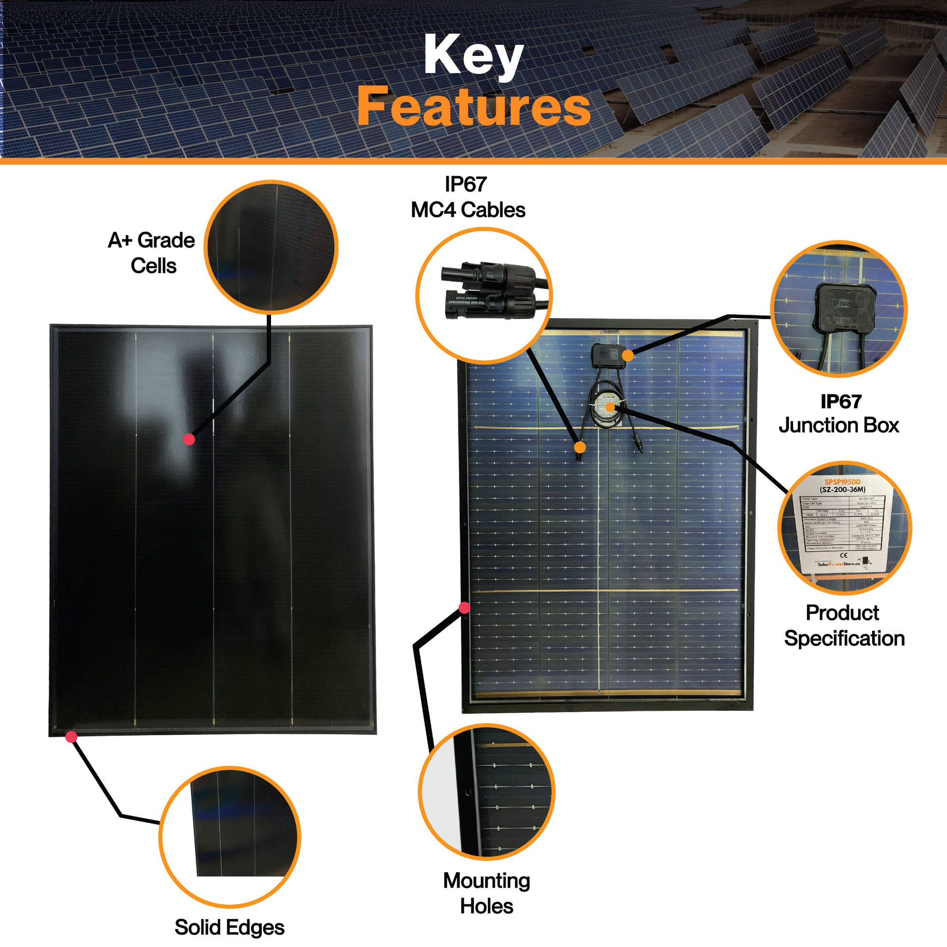 This solar panel also features an IP67-rated junction box, demonstrating resilience against challenging weather conditions. With the ability to withstand wind loads up to 2400Pa/0.35 PSI and snow loads up to 5400Pa/0.75 PSI, it's a reliable, long-term investment for sustainable energy.