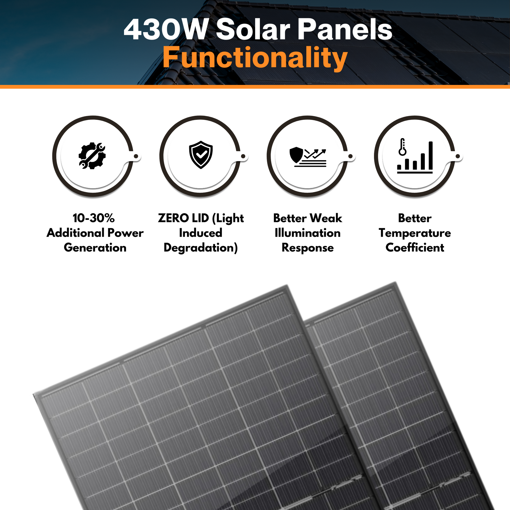 - Outstanding Bifacial Energy Production: Maple Leaf Solar's 430W All-Black Bifacial Solar Panel distinguishes itself with an exceptional capacity to capture sunlight from both sides, delivering a surplus of 30% more energy compared to conventional solar panels.